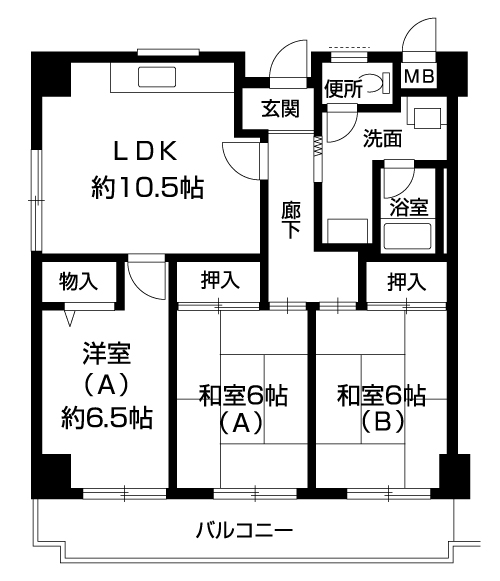 【204号室 募集中】即入居可 3LDK 65.75㎡ バルコニー10.54㎡ 南向き ※掲載写真は別のお部屋です。照明・エアコンは付いておりません。 |